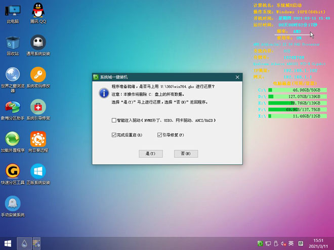 接下来,系统自动重启进入PE系统恢复镜像,这里一直到后面安装成功都是全自动的,你可以适当休息耐心等待系统安装成功,如下图所示。