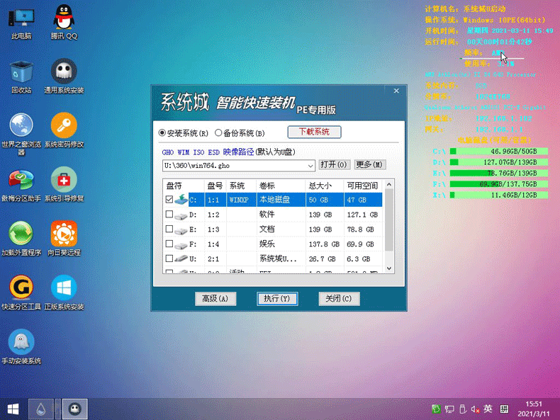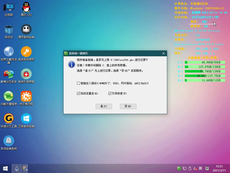 等待系统城PE装机工具提取所需的系统文件后,在下方选择一个磁盘分区用于安装系统使用,然后点击“确定(Y)”进入下一步操作。如下图所示