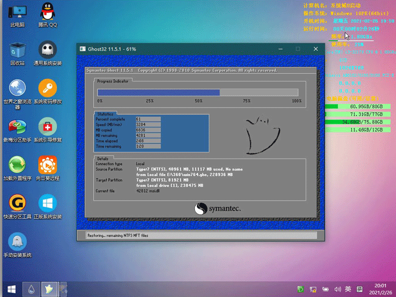 此时耐心等待系统文件释放至指定磁盘分区的过程结束。如下图所示