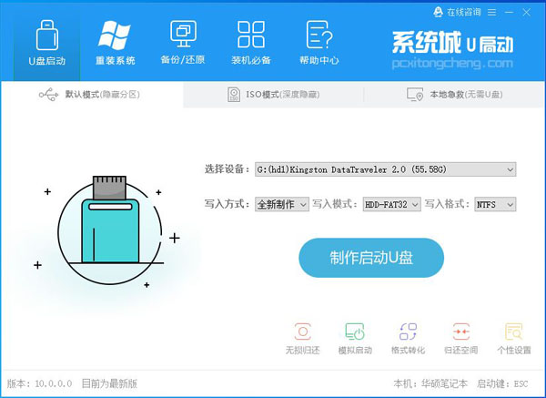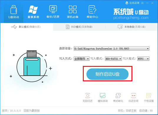 下载并且安装好系统城二合一版,打开安装好的系统城二合一版,插入u盘等待软件成功读取到u盘之后,点击“开始制作”进入下一步操作。如下图所示