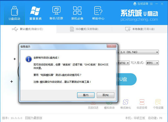 完成写入之后,在弹出的信息提示窗口中,点击“是(Y)”进入模拟电脑。如下图所示。